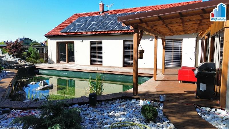Naše společnost Mixreality Vám nabízí k prodeji moderní, plně vybavený a nadstandardně řešený rodinný dům typu bungalov o dispozic Rozbaliti 4+kk, který se nachází v klidné a žádané lokalitě Nýřany – Kamenný Újezd, jen pár minut od Plzně. Dům je situován na rovinatém, oploceném pozemku o celkové výměře 1000 m?. Zastavěná plocha činí 149 m?, užitná plocha 115 m?.Interiér domu nabízí obývací pokoj s kuchyňským koutem a jídelní částí, tři samostatné ložnice, velkou koupelnu s vanou i sprchovým koutem a praktickou technickou místnost. Dominantou domu je prostorná terasa, která tvoří ideální zázemí pro odpočinek i rodinná setkání.Dům se prodává kompletně zařízený, včetně moderní kuchyňské linky se spotřebiči, vestavěného nábytku luxusními napnutými stropy a dalšího vybavení. Vytápění a ohřev teplé vody zajišťuje úsporné tepelné čerpadlo. Součástí domu je také fotovoltaická elektrárna s výkonem 10 kWp, která výrazně snižuje náklady na provoz. Komfort bydlení doplňuje kamerový systém a elektricky ovládané žaluzie na všech oknech.Součástí exteriéru je wellness zóna s kvalitní vířivkou, posilovnou a samostatnou finskou saunou. Na pozemku se dále nachází přírodní koupací jezírko o ploše 50 m? s vlastní čističkou vody, zahrádka se zvýšenými záhony, plechová garáž a zastřešené parkovací stání pro dva automobily. Celý pozemek je oplocen a nabízí maximální soukromí i bezpečí.Tato nemovitost je ideální volbou pro rodinu, která hledá moderní, úsporné a nadstandardní bydlení v klidné lokalitě s výbornou dostupností do Plzně. Lokalita Kamenný Újezd u Nýřan je vyhledávaná pro svou kombinaci přírody, klidu a občanské vybavenosti v dosahu.V případě zájmu o více informací nebo domluvení prohlídky nás neváhejte kontaktovat.