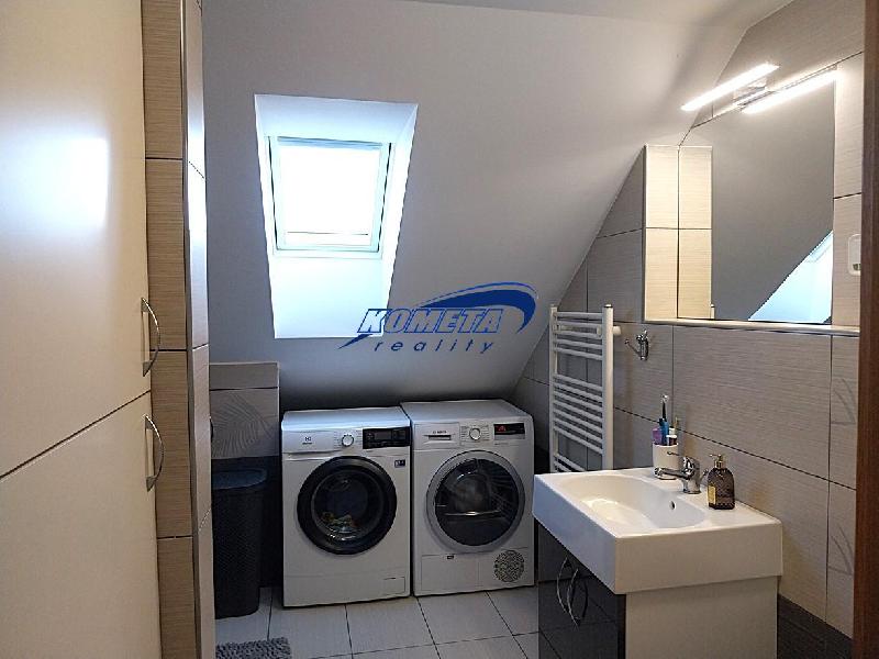 Nabízíme k prodeji světlý a útulný podkrovní byt o dispozici 3+kk a celkové ploše 69m2 + sklep 16m2. Byt je kolaudovaný v roce 20 Rozbalit15 a nabízí moderní bydlení s velmi praktickým uspořádáním. Veškerá projektová dokumentace, včetně příslušných povolení bude novému majiteli předána. Plocha bytu se dá dále rozšířit (zvětšit) o prostory nad stropem. Z chodby bytu je přístupná pochozí půda, kterou lze využít pro další uskladnění věcí. Dispozice bytu zahrnuje obývací pokoj s kuchyňským koutem, dvě samostatné ložnice, koupelnu s vanou a WC. Součástí je spousta úložného prostoru a samostatná šatna přiléhající k pokoji. Střešní okna v pokojích jsou opatřena vnitřními zcela zatemňujícími roletami. Všechna střešní okna pak mají i vnější zatemňující síťku. Toto opatření přináší vysoký standard zejména v letních měsících. Dalším komfortem bydlení, je nainstalovaná klimatizační jednotka. Vytápění zajišťuje elektrický kotel, umožňuje tak regulaci nákladů dle vlastní potřeby. Měsíční náklady: 4.500,-Kč záloha elektřina (vrací se) 1.000,-Kč FO 890,-Kč vodné + provoz a správa domu Velikosti místností: 4,67m2 - předsíň 7,21m2 - koupelna 26,61 m2 - obývací prostor s kuchyní a jídelnou 18,76m2 - ložnice 11,49m2 - pokoj 16m2 - zděný sklep Okolí domu má dostatečné množství parkování, za domem je prostorné dětské hřiště. Okolí pak vybízí k procházkám. Obec Vranovice je ve vynikající dojezdové vzdálenosti jak do Brna nebo Pohořelic, ale třeba i Hustopečí a Břeclavi. V obci je škola s bazénem, školka, lékaři i lékárna. Byt je výborný jak pro rodinu, tak i pro milovníky toulek po okolí. Jedná se o velmi klidnou lokalitu s blízkostí Aqualendu Morávia a Pálavy. Cena nemovitosti je uvedena bez odměny RK. Energetický štítek nebyl dosud dodán, proto uvádíme /G/. Pro více informací či prohlídku prosím kontaktujte makléře.